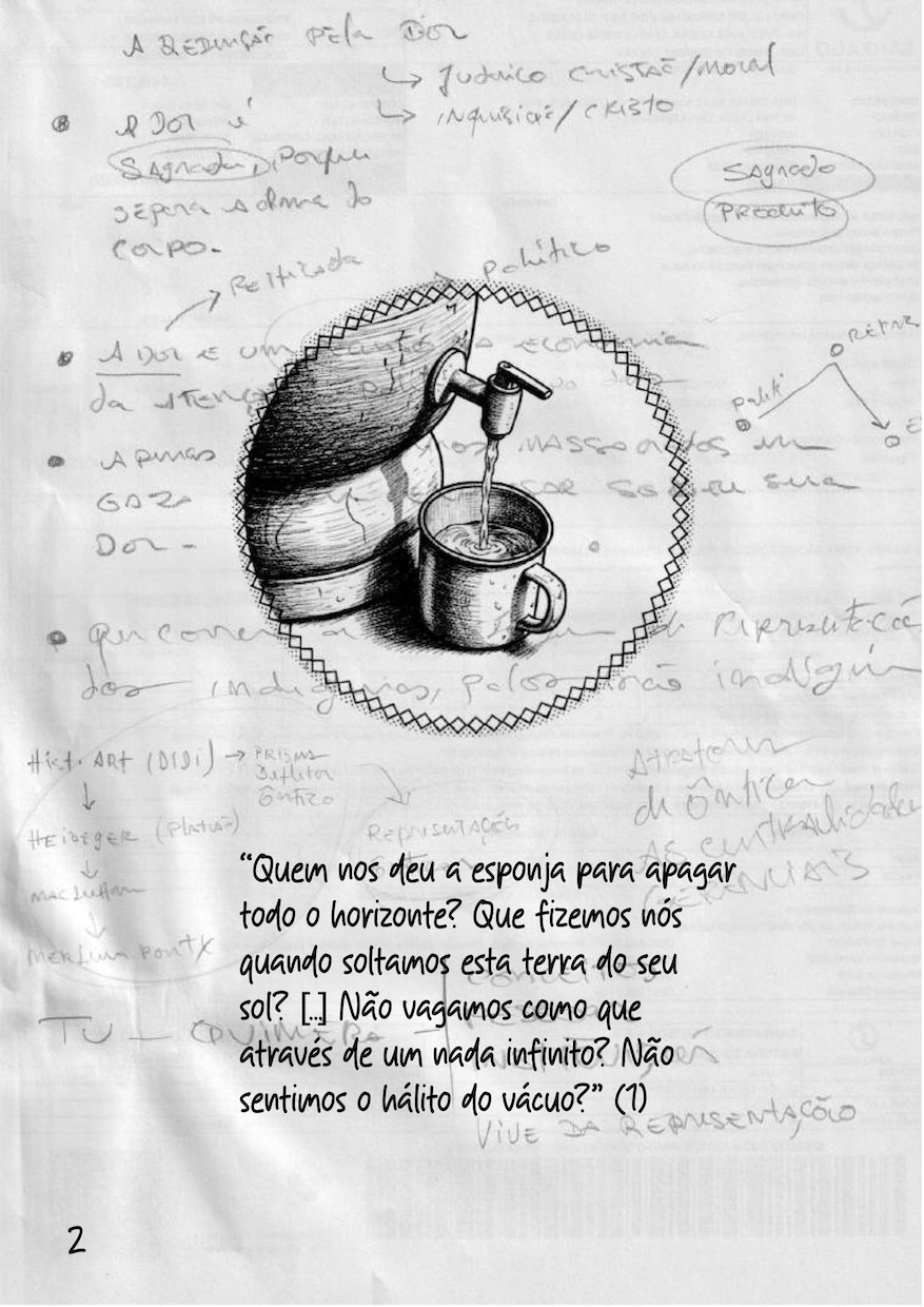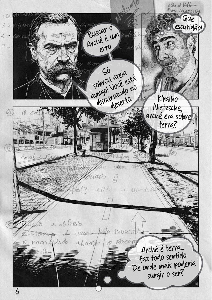 Ao longo do percurso, a HQ encena encontros e diálogos com filósofos deslocados para a rua — figuras mendigantes, irônicas, intempestivas — que funcionam como coro crítico da “esgotização” do mundo: o córrego vira esgoto, o horizonte parece apagado, e a experiência de cidade se torna uma forma concreta de niilismo. Nietzsche irrompe como voz que intensifica a sensação de desertificação; Heráclito reaparece como pensamento do fluxo em choque com o colapso ambiental; Diógenes e outros surgem como contrapontos éticos e cômicos à autoridade e às ilusões de controle; Foucault entra como ruído produtivo para tensionar a ideia de conhecimento como posse, herança ou genealogia.