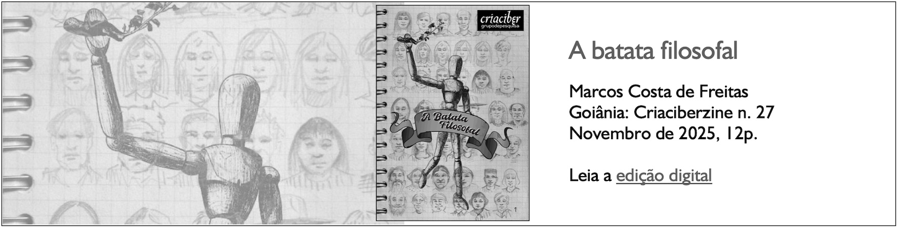Os Cria_ciberzines são uma produção dos integrantes do grupo de pesquisa Criação e Ciberarte (CRIA_CIBER), liderado pelo professor-pesquisador e artista transmídia Edgar Franco (@ciberpaje), com edição de Gazy Andraus e Léo Pimentel. Coord. geral do Ciberpajelanças: Edgar Franco (Ciberpajé). Inserção e montagem dos zines para a Marca de Fantasia em pdf por G. Andraus. Link ao Instagram do CRIA_CIBER (Cria_ciberzines), a cargo de Ícaro Malveira (e criaciberes): https://www.instagram.com/cria_ciber/
