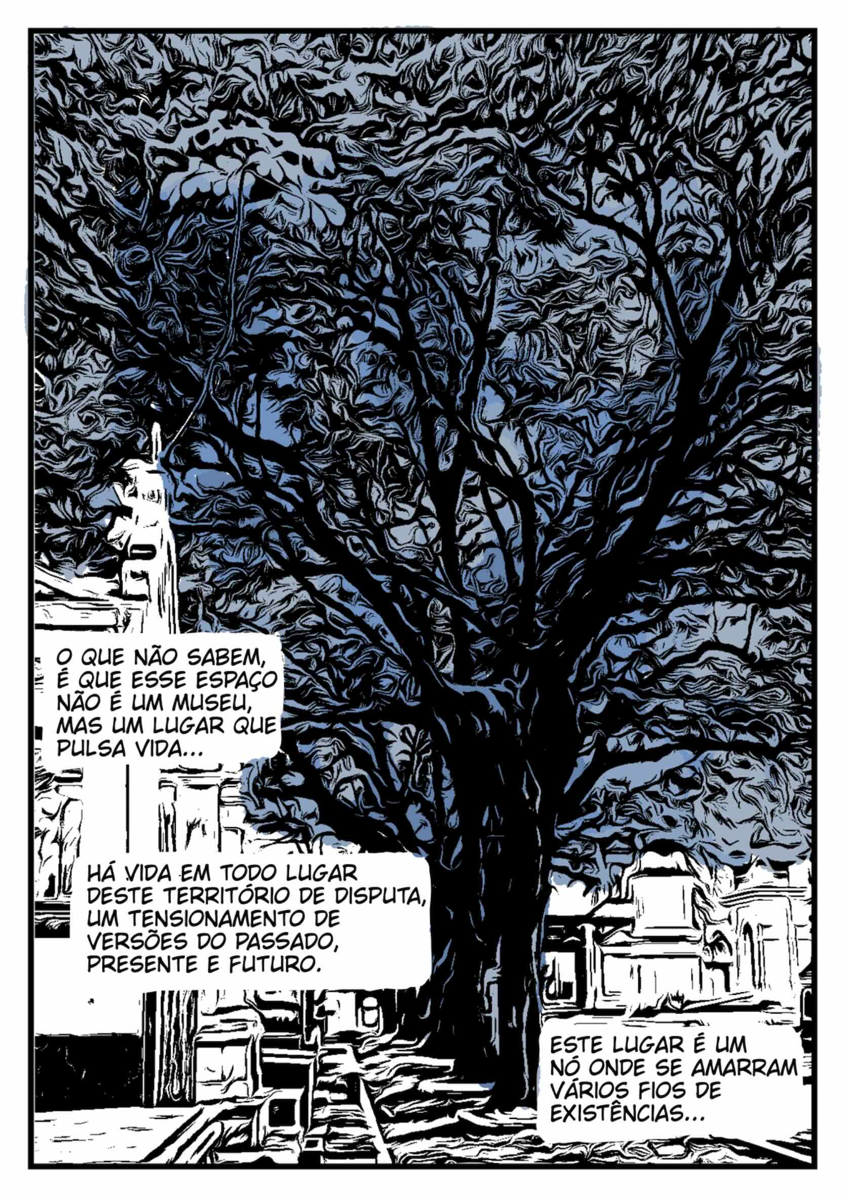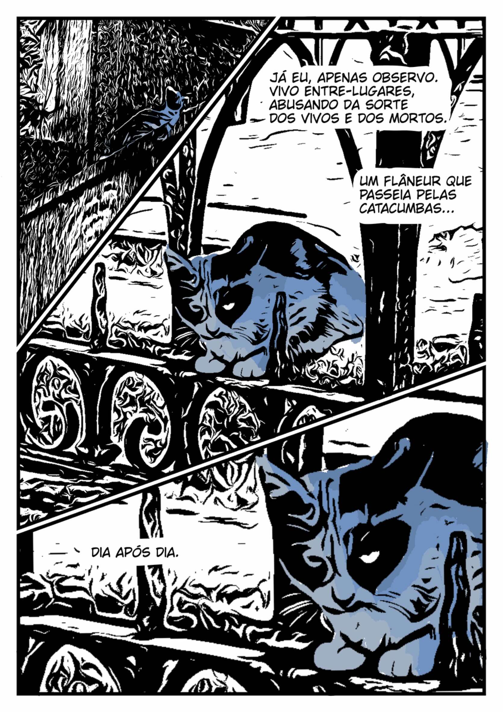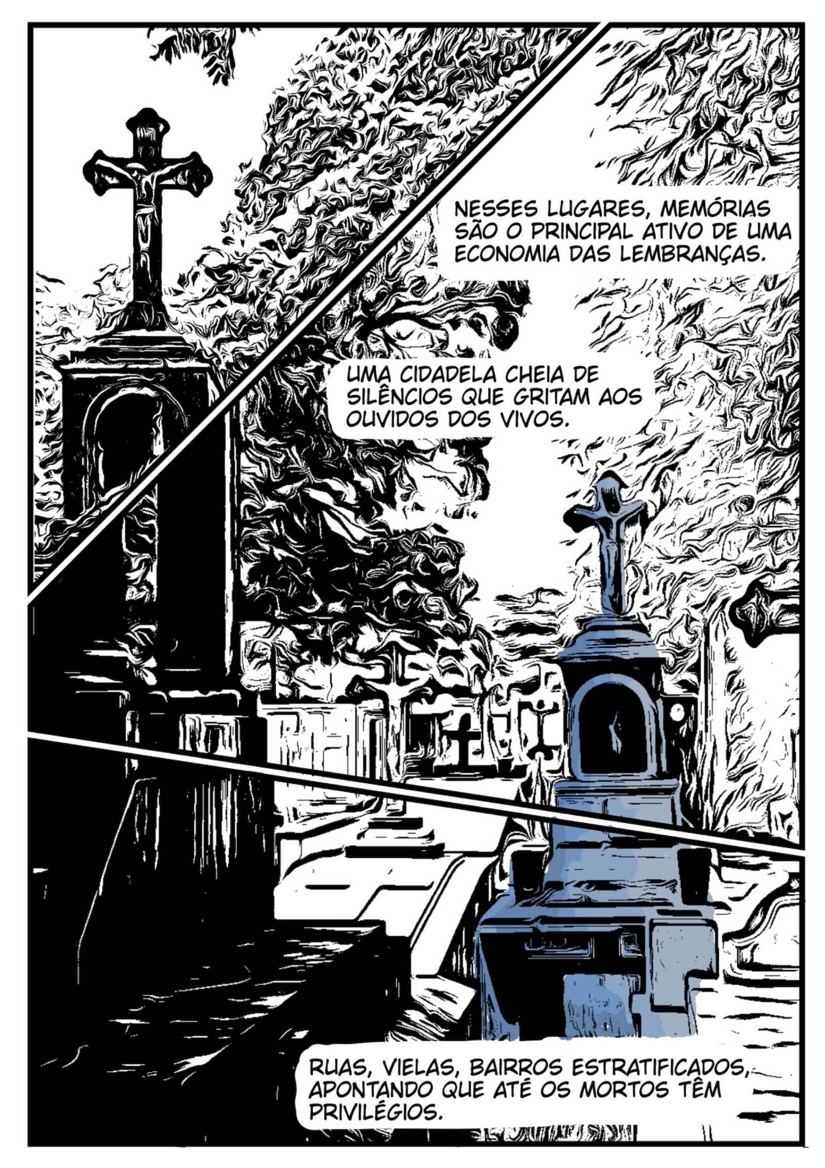 Este quadrinho é o resultado de uma escuta. Não apenas das vozes que habitam o mundo visível, mas também daquilo que vibra no intervalo entre as coisas, o murmúrio dos túmulos, o silêncio das ruas, o sopro que o tempo deixa preso nas pedras e nas lápides. Caminhar entre os mortos foi, para mim, uma forma de pensar os vivos.