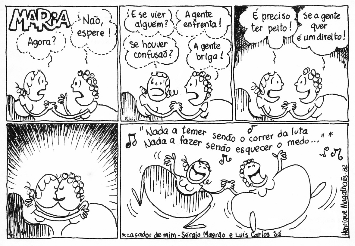Nessa tira inspirada na música “Caçador de mim”, de Sérgio Magrão e Luís Carlos Sá, imortalizada na voz de Milton Nascimento, Maria chama para a luta em defesa da liberdade amorosa.
