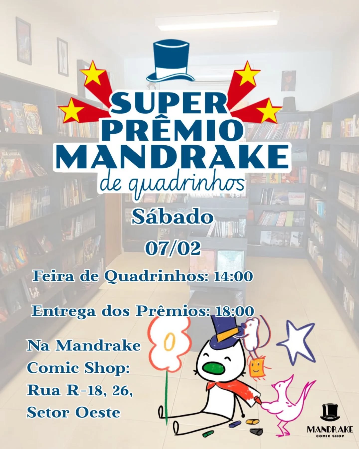 A cerimônia de entrega do "Super Prêmio Mandrake de Quadrinhos – Melhores de 2025” acontecerá no Espaço Cultural e Comic Shop Mandrake no dia 7 de fevereiro de 2026 às 18h, à rua R-18, n° 26, Setor Oeste, Goiânia.