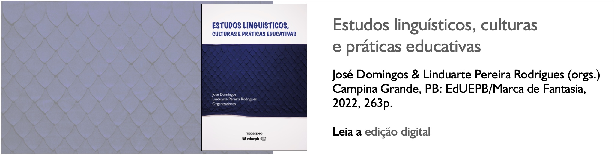 Almejamos que as leituras realizadas com este livro colaborem com a função social dos estudos acadêmicos, que fomentam a criticidade da produção de conhecimentos, em específico, os concernentes aos estudos linguísticos, discursivos, culturais e que dialogam direta ou indiretamente com a formação docente. Dessa forma, sinta-se convidado para contribuir com a sua leitura neste espaço de discussões e diálogos possibilitado pelo agir científico em via contemporânea. José Domingos