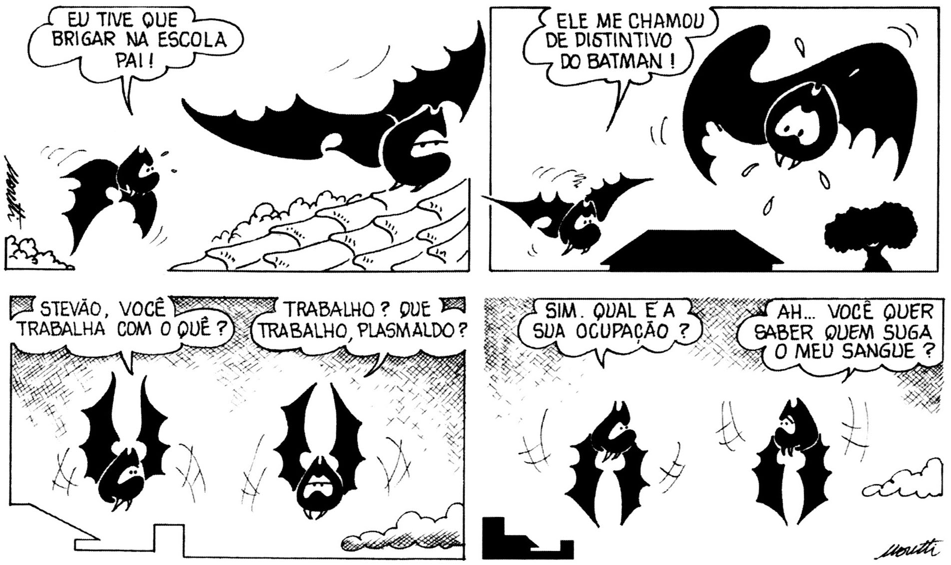 Muita coisa já me escapa à memória, mas lembro, do trabalho de Moretti, principalmente das tiras de “Estevão Piro”, personagem de humor com fina ironia e abordagem diferenciada, inovadora entre tantas personagens que surgiam nos jornais brasileiros a partir da década de 1970. “Stevão” foi publicado principalmente na imprensa do Sudeste, mas a participação no catálogo da ECAB - distribuidora de tiras brasileiras no molde dos “syndicates” americanos - fê-lo voar por outras paragens.